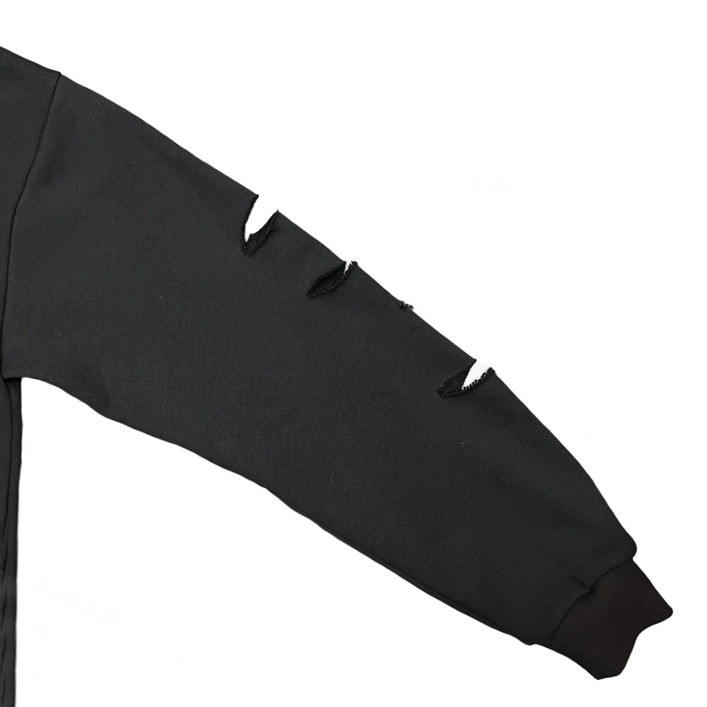 袖には大胆なスラッシュ(カットアウト)デザインを施し、インナーがちらりと見えるアレンジが特徴。